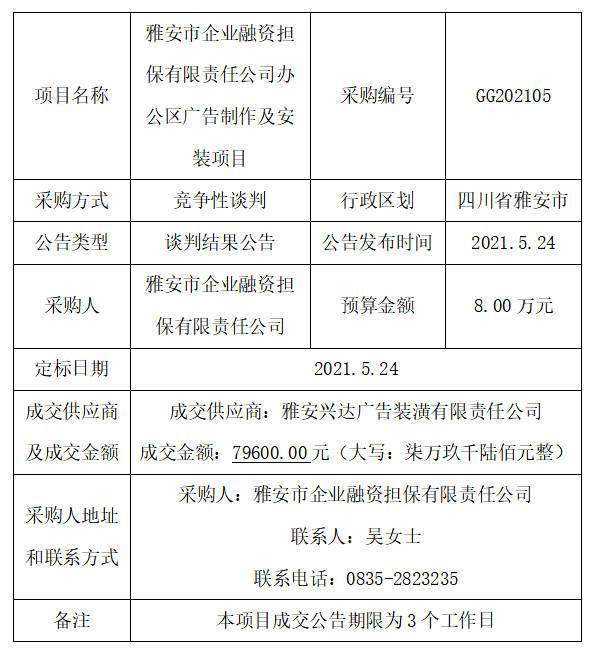 雅安市企業(yè)融資擔(dān)保有限責(zé)任公司辦公區(qū)廣告制作及安裝項目競爭性談判結(jié)果公告
